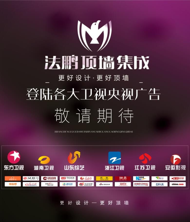 法鵬頂墻集成繼登陸央視和浙江、江蘇、東方、湖南衛(wèi)視以后,還將登陸安徽影視頻道和山東綜藝頻道兩大強(qiáng)勢(shì)地方頻道,這意味著法鵬頂墻集成品牌地位得到進(jìn)一步提升,全國(guó)各地將會(huì)有更多電視觀眾認(rèn)識(shí)法鵬,關(guān)注法鵬。