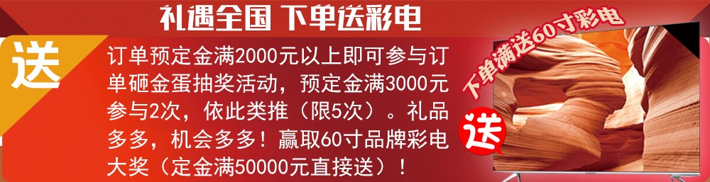 訂單預(yù)定金滿2000元以上即可參與訂單砸金蛋抽獎(jiǎng)活動(dòng),預(yù)定金滿3000元參與2次,依此類推(限5次)。禮品多多,機(jī)會(huì)多多!贏取60寸品牌彩電大獎(jiǎng)(定金滿50000元直接送)!