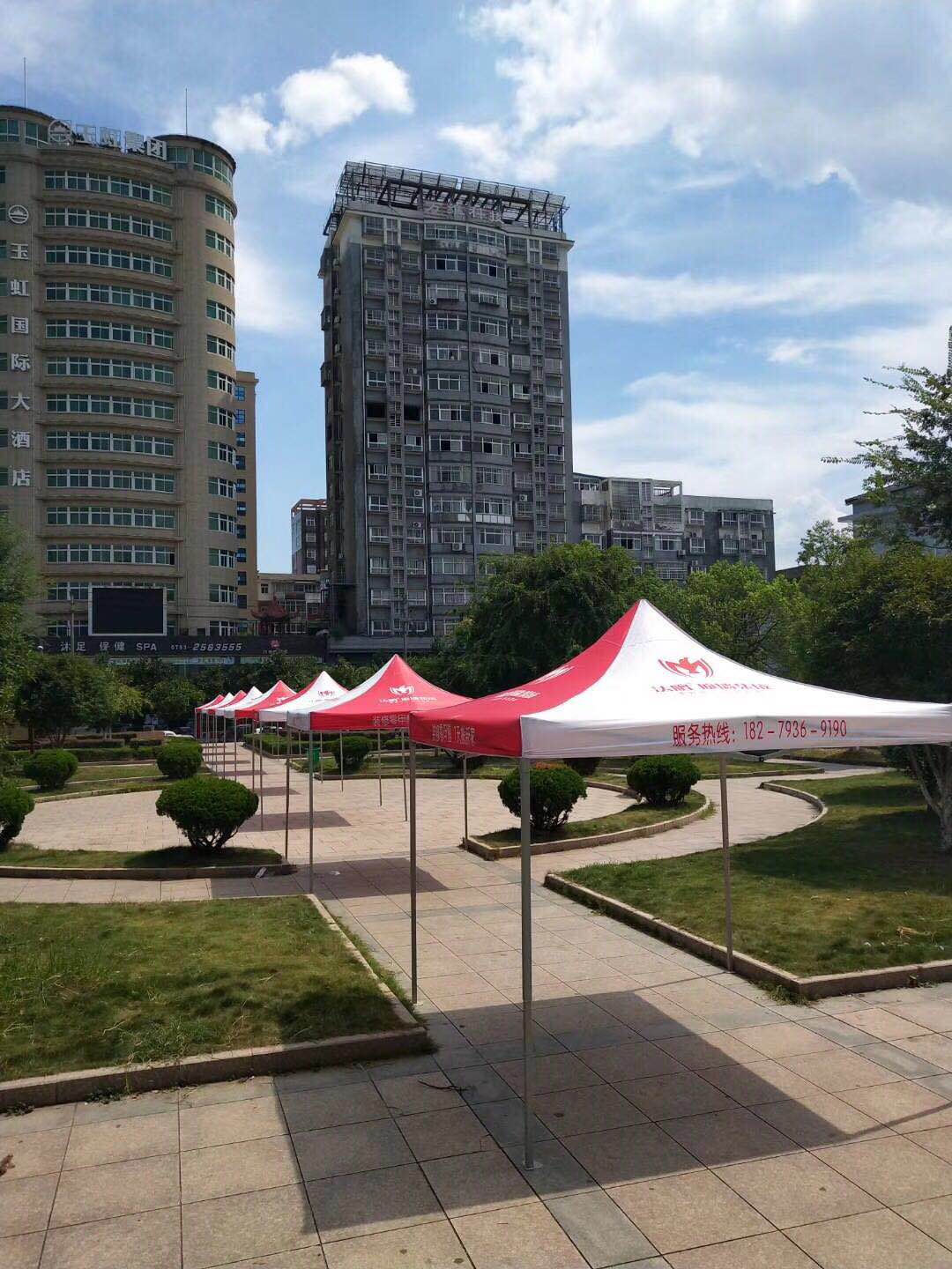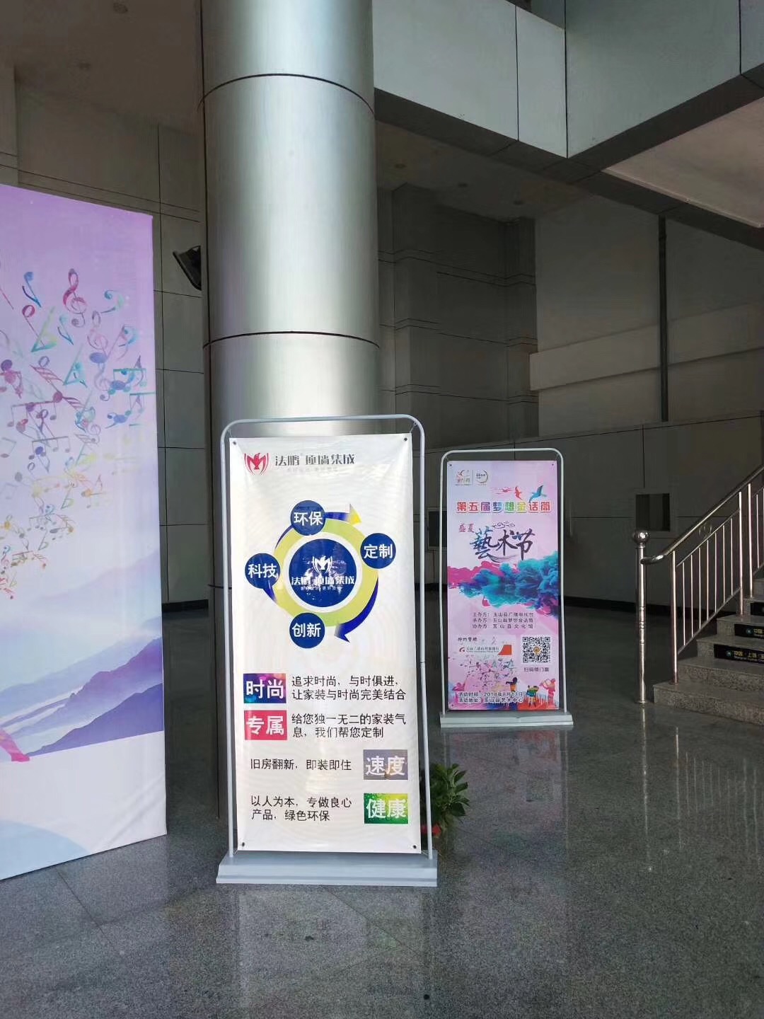 法鵬頂墻集成在門口豎起了易拉寶和簡易棚