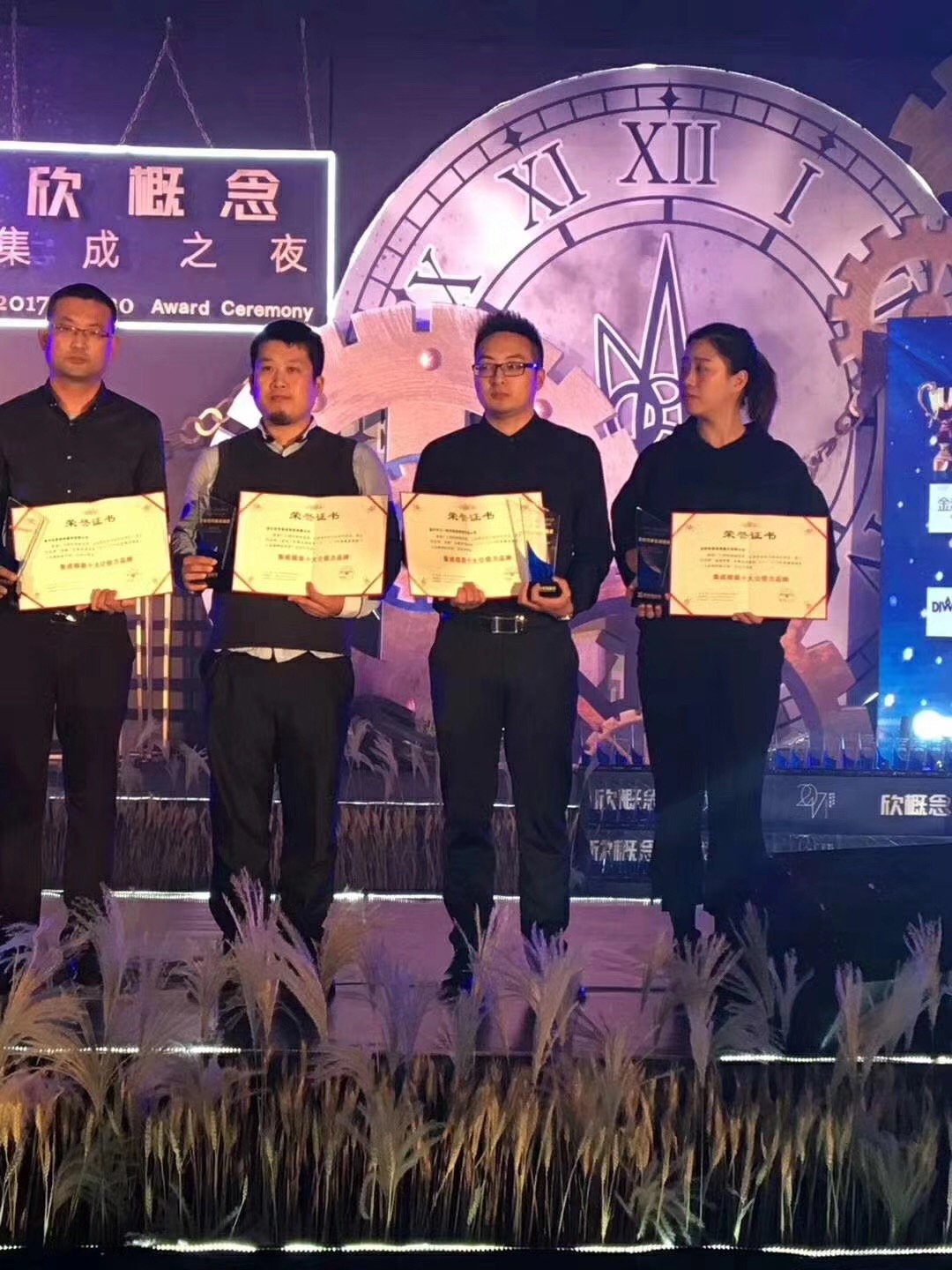 法鵬頂墻集成代表張寧(左三)上臺(tái)領(lǐng)獎(jiǎng)